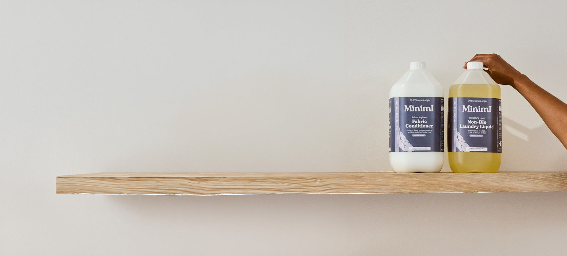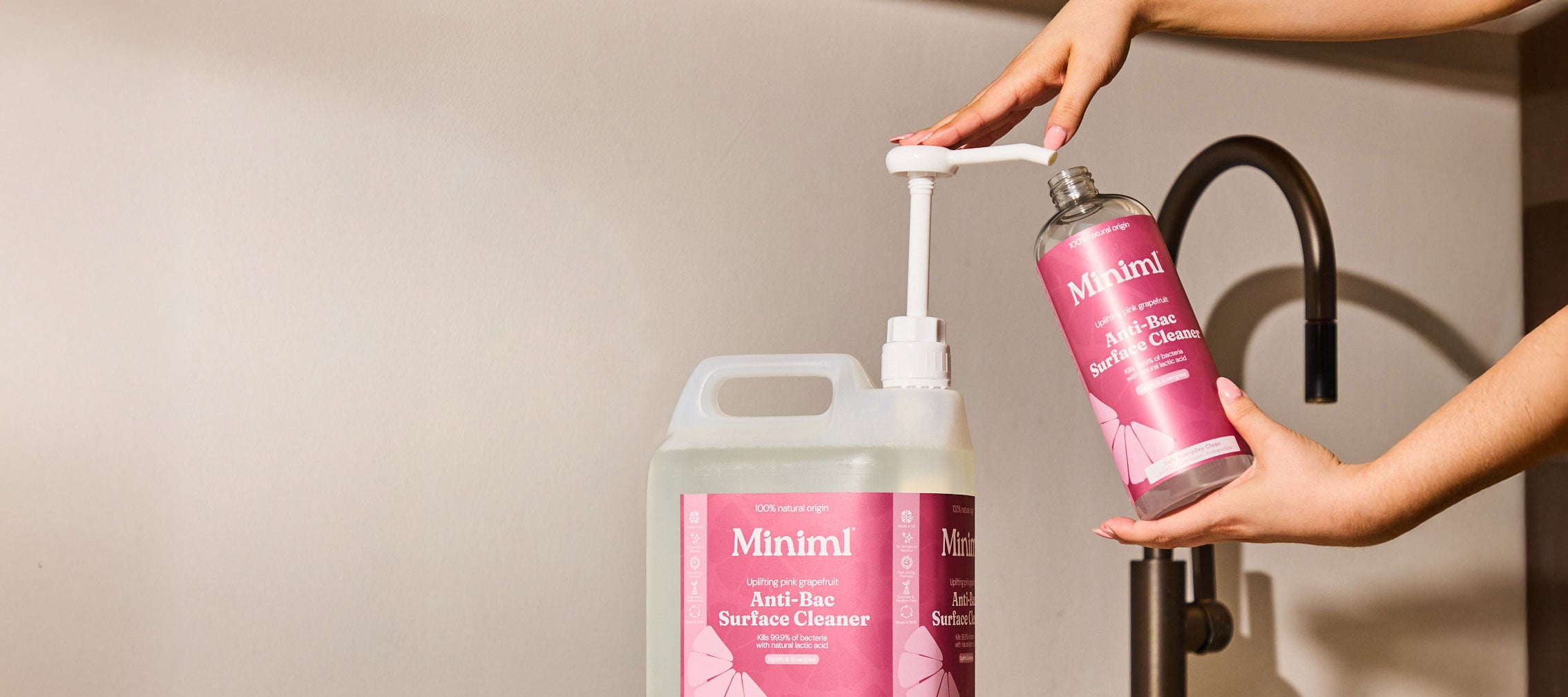 Our 1L and 5L refills are made to be refilled & reused many times. All packaging is made from multi-layered, BPE-free plastics, ensuring their durability and safety for multiple re-use. Miniml’s pioneering technologies allow us to clean & sanitise each refill batch in just under 2 minutes, using green-powered energy and preserving water with our filtering system. This process helps us not only save millions of refills from landfill, but also reduce our carbon footprint.