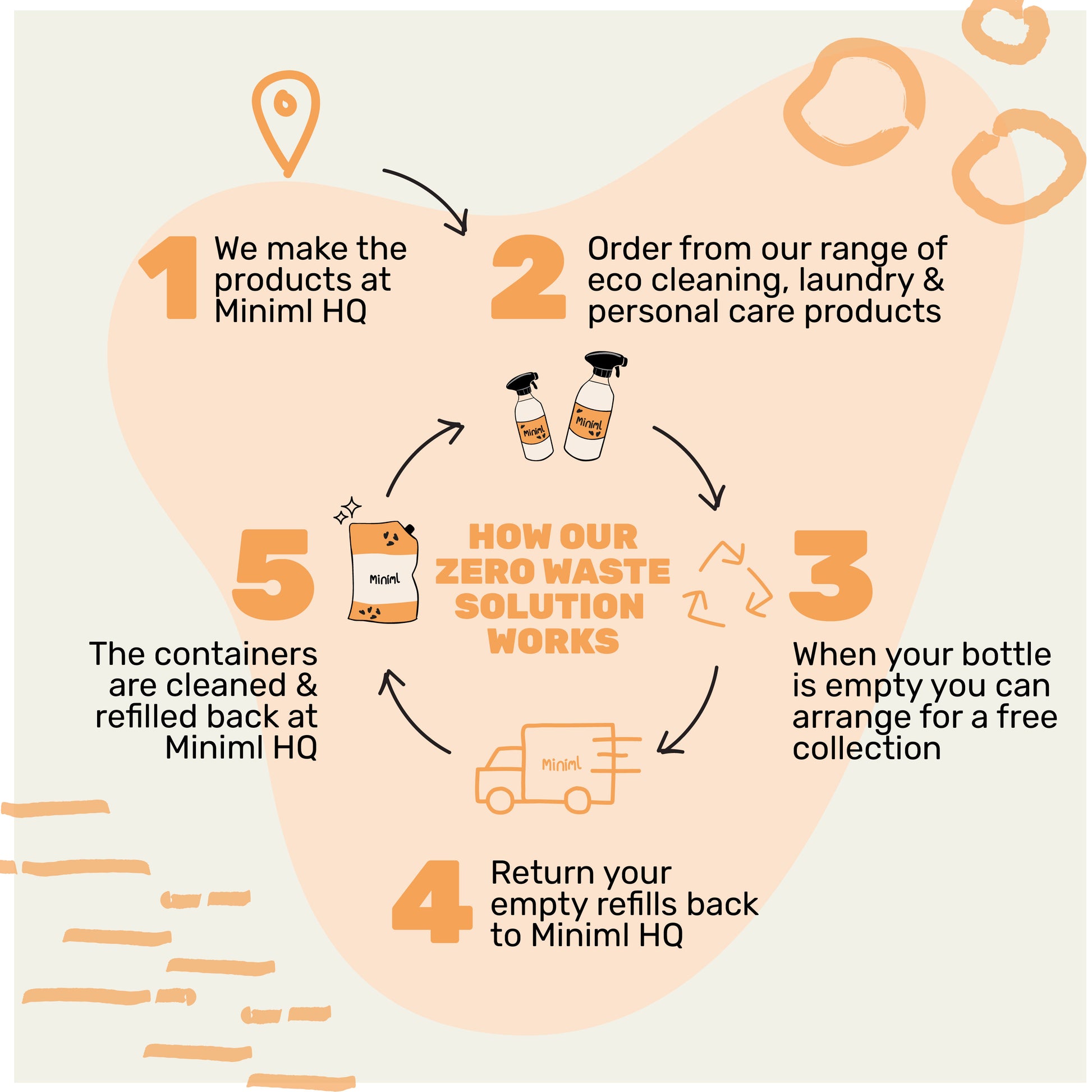 At Miniml, we don't believe in single use plastic or recycling. That's why we reuse and refill every bottle that we supply to create a completely zero waste supply chain. Our refill containers are designed to be returned to Miniml HQ to be cleaned and re-used again and again...and again!