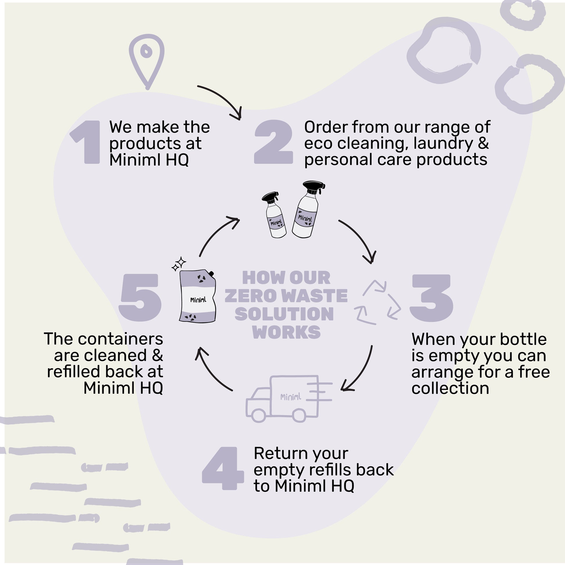 At Miniml, we don't believe in single use plastic or recycling. That's why we reuse and refill every bottle that we supply to create a completely zero waste supply chain. Our refill containers are designed to be returned to Miniml HQ to be cleaned and re-used again and again...and again!