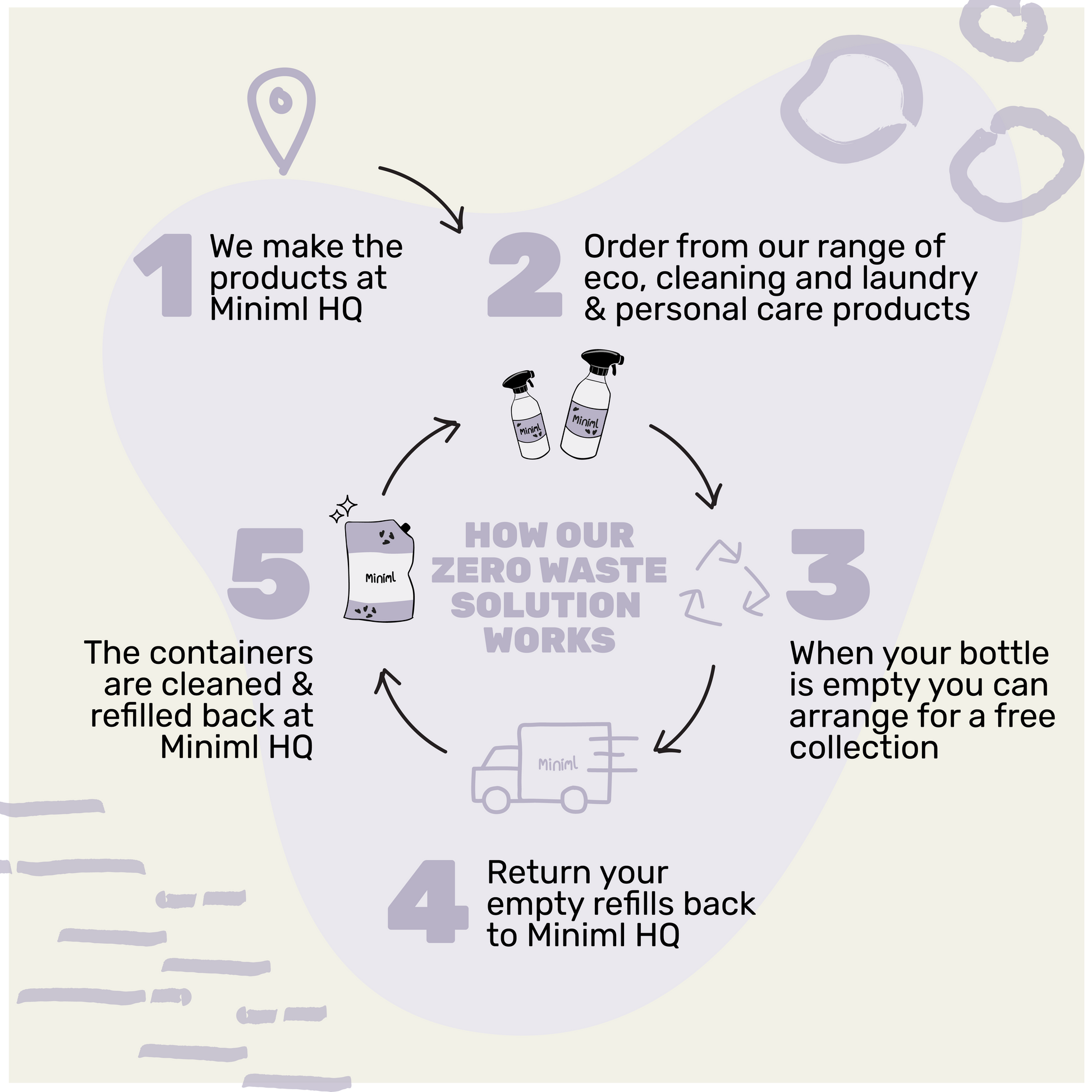 At Miniml, we don't believe in single use plastic or recycling. That's why we reuse and refill every bottle that we supply to create a completely zero waste supply chain. Our refill containers are designed to be returned to Miniml HQ to be cleaned and re-used again and again...and again!