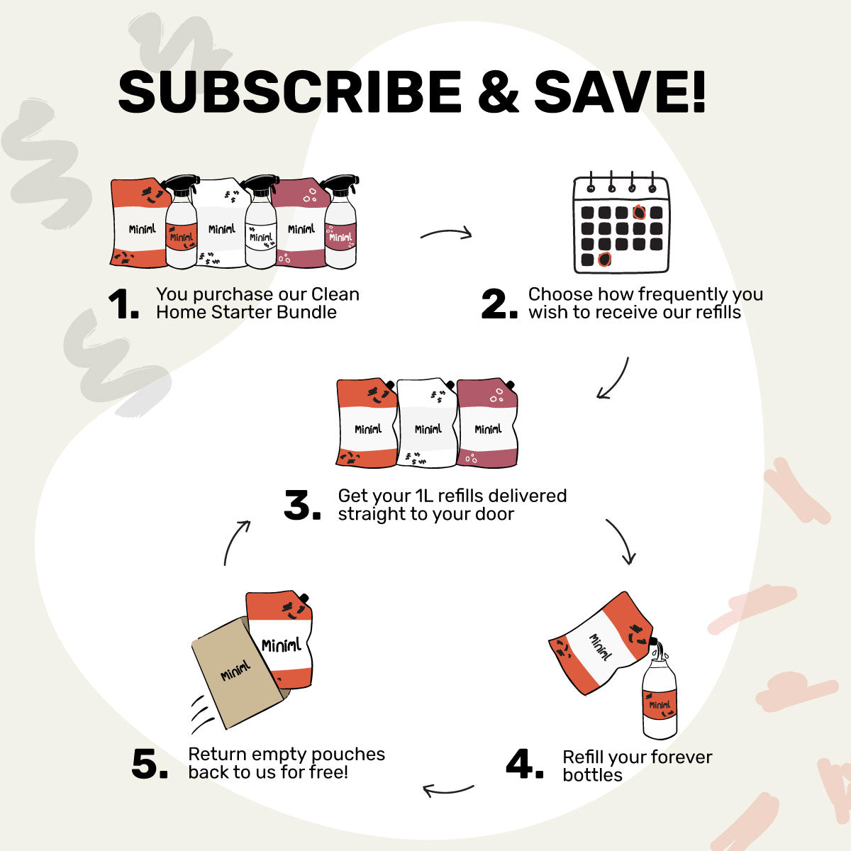 At Miniml, we don't believe in single use plastic or recycling. That's why we reuse and refill every bottle that we supply to create a completely zero waste supply chain. Our refill containers are designed to be returned to Miniml HQ to be cleaned and re-used again and again...and again!