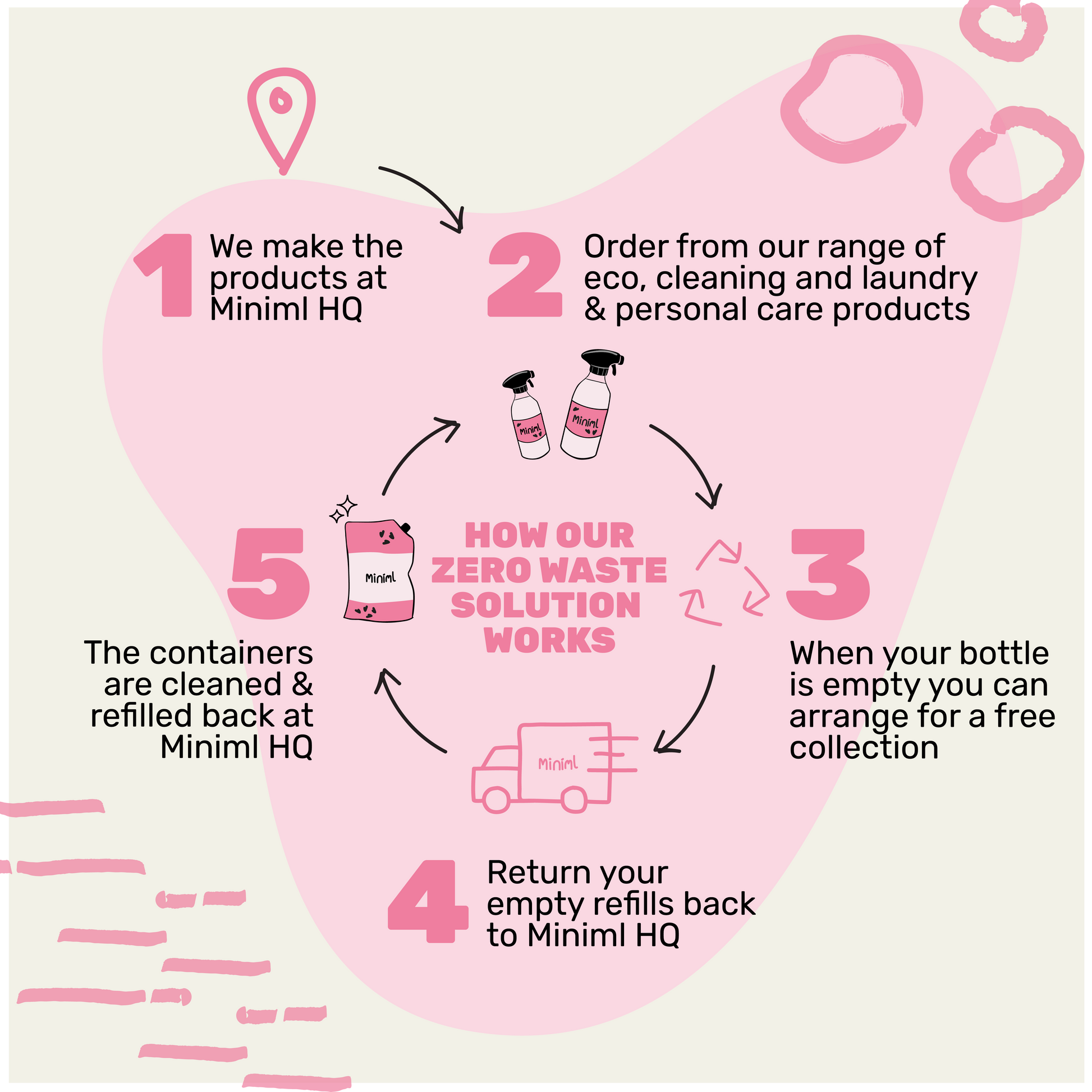 At Miniml, we don't believe in single use plastic or recycling. That's why we reuse and refill every bottle that we supply to create a completely zero waste supply chain. Our refill containers are designed to be returned to Miniml HQ to be cleaned and re-used again and again...and again!