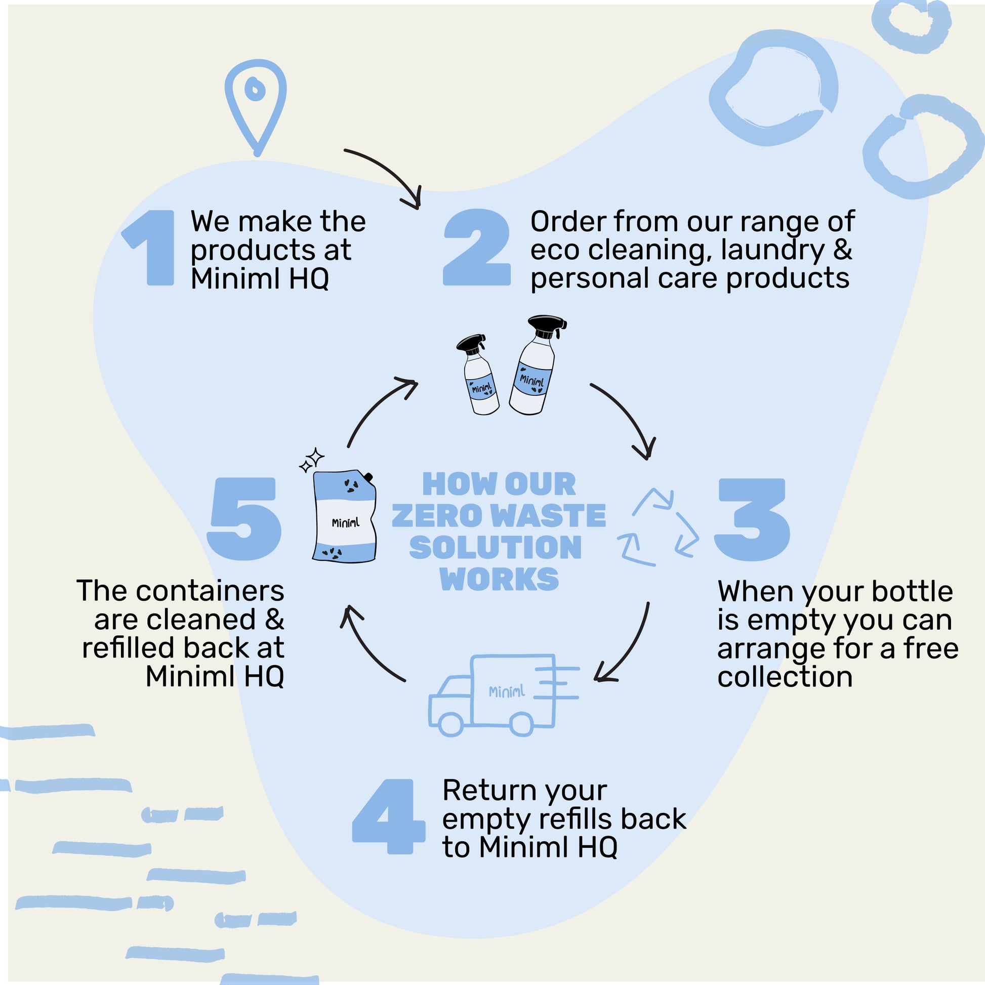 At Miniml, we don't believe in single use plastic or recycling. That's why we reuse and refill every bottle that we supply to create a completely zero waste supply chain. Our refill containers are designed to be returned to Miniml HQ to be cleaned and re-used again and again...and again!