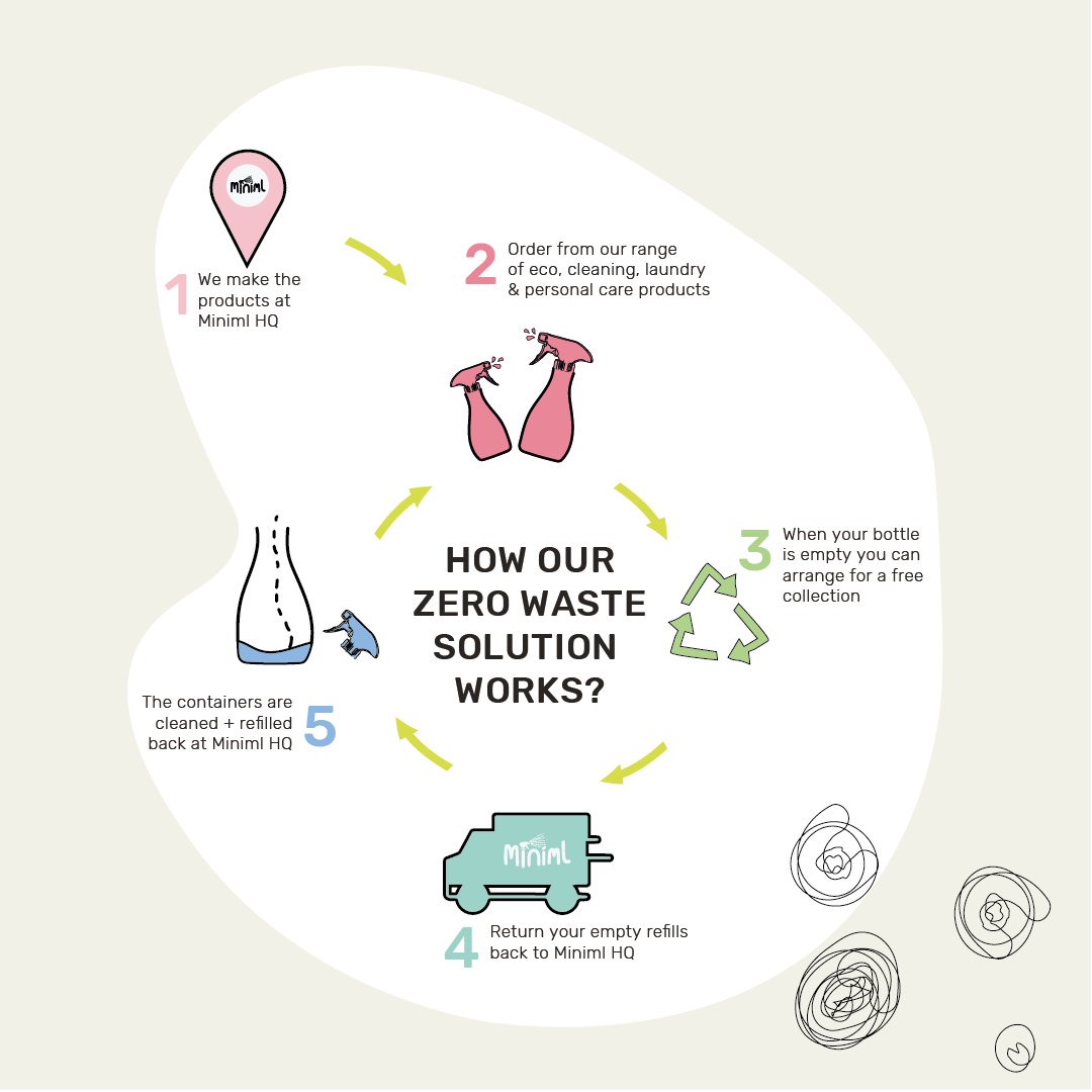 At Miniml, we don't believe in single use plastic or recycling. That's why we reuse and refill every bottle that we supply to create a completely zero waste supply chain. Our refill containers are designed to be returned to Miniml HQ to be cleaned and re-used again and again...and again!