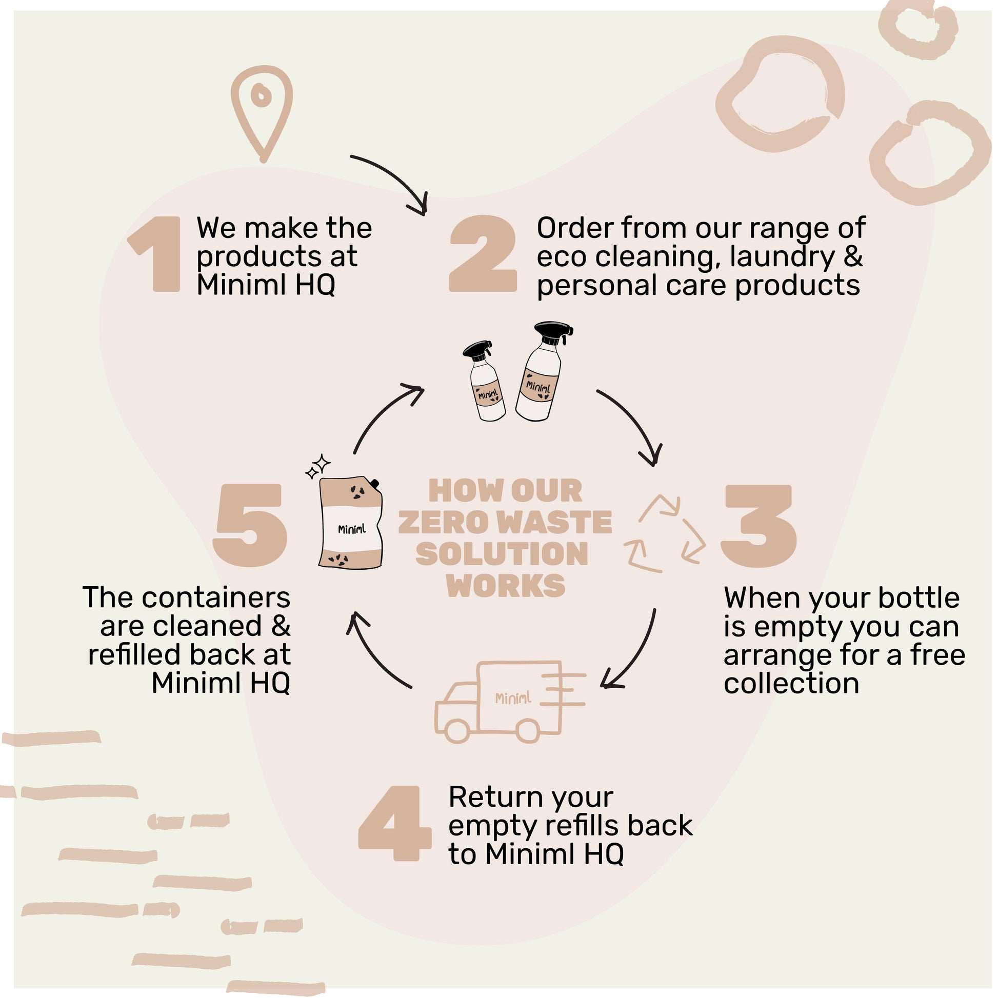 At Miniml, we don't believe in single use plastic or recycling. That's why we reuse and refill every bottle that we supply to create a completely zero waste supply chain. Our refill containers are designed to be returned to Miniml HQ to be cleaned and re-used again and again...and again!