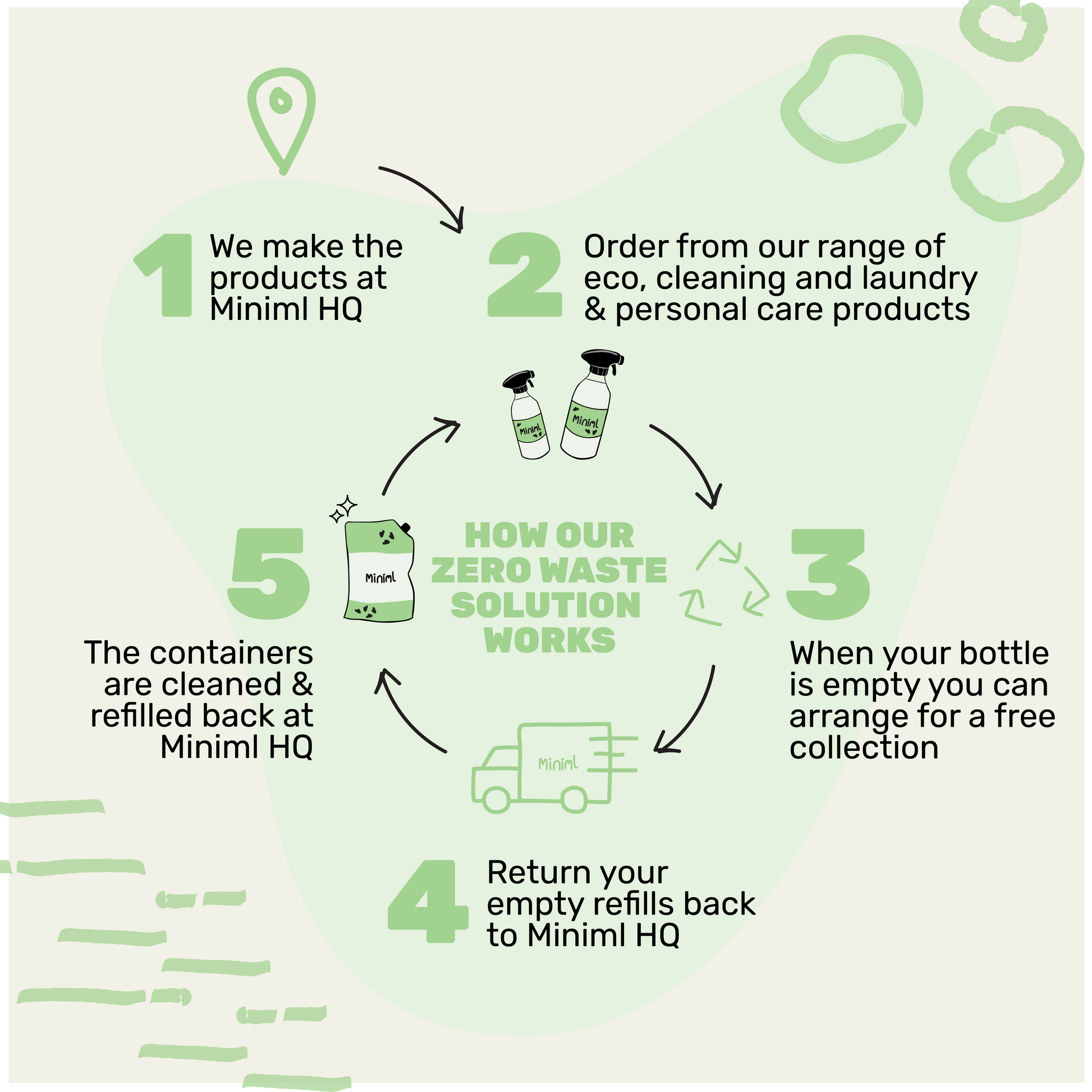 At Miniml, we don't believe in single use plastic or recycling. That's why we reuse and refill every bottle that we supply to create a completely zero waste supply chain. Our refill containers are designed to be returned to Miniml HQ to be cleaned and re-used again and again...and again!