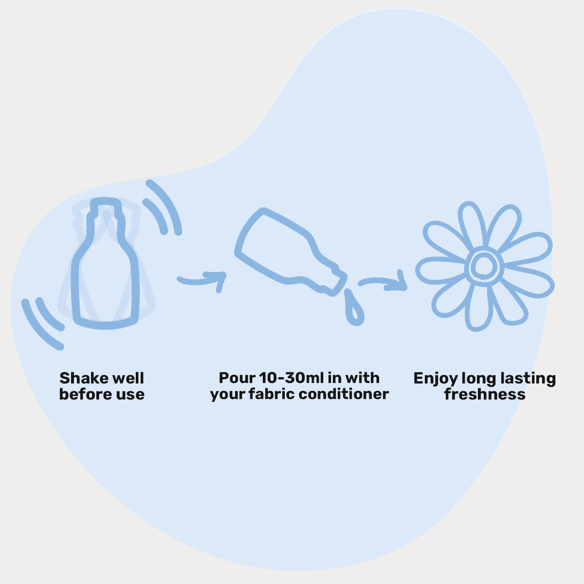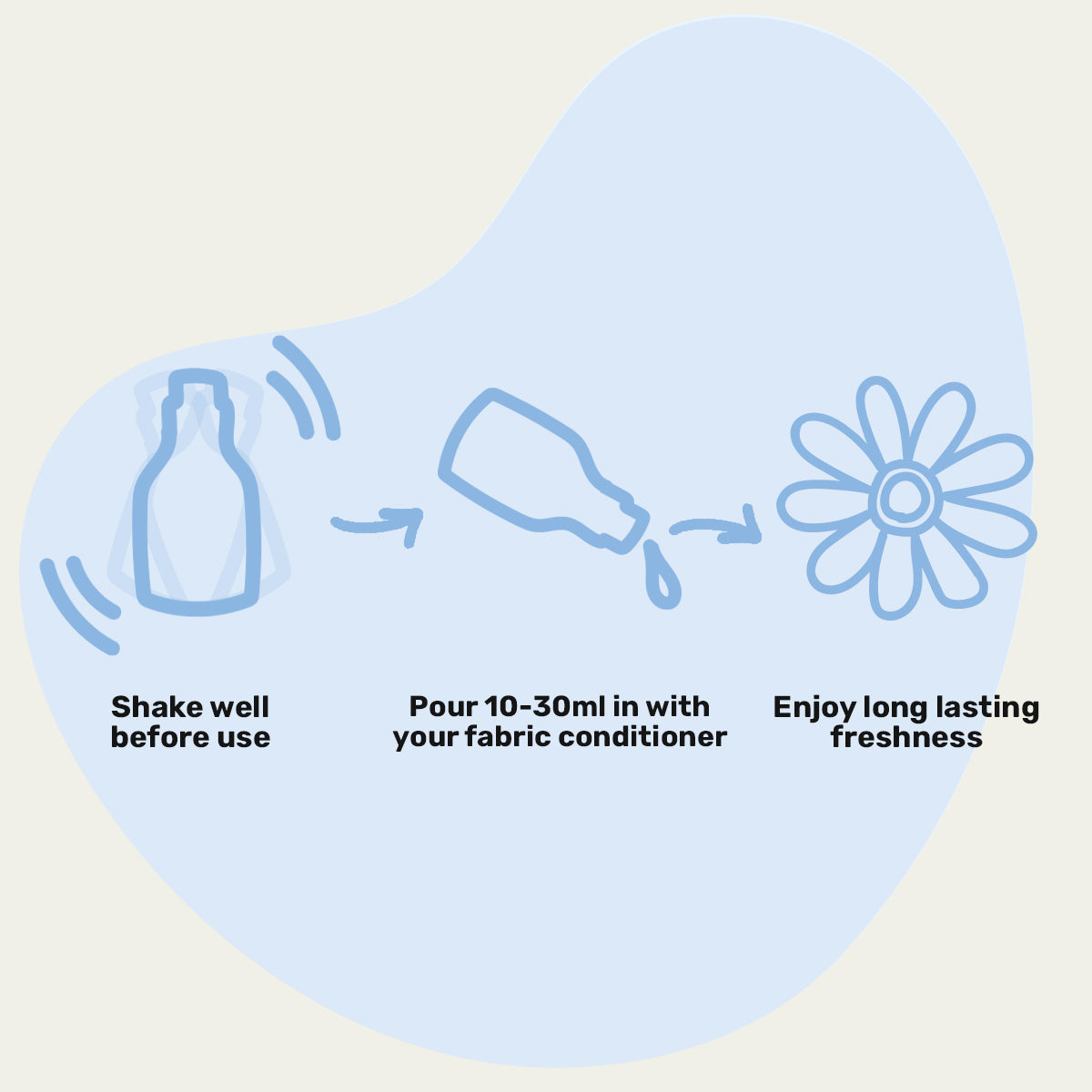 Shake well before use as the essential oils may separate from the other ingredients as it sits. Pour 10-30ml into your machine where you usually put fabric conditioner depending on how strong you'd like the scent and how large or soiled your wash is. Run the cycle as normal!