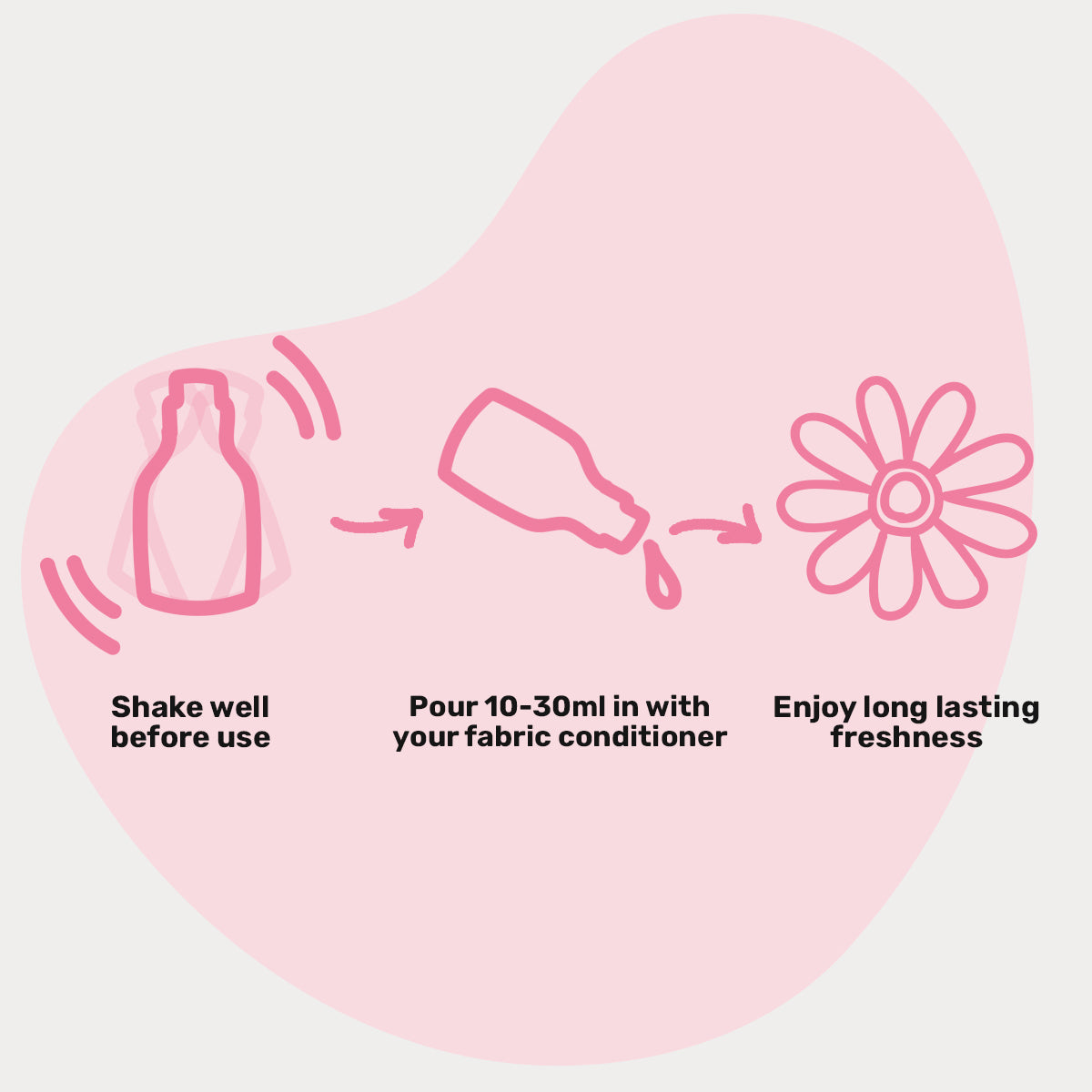 Shake well before use as the essential oils may separate from the other ingredients as it sits. Pour 10-30ml into your machine where you usually put fabric conditioner depending on how strong you'd like the scent and how large or soiled your wash is. Run the cycle as normal!