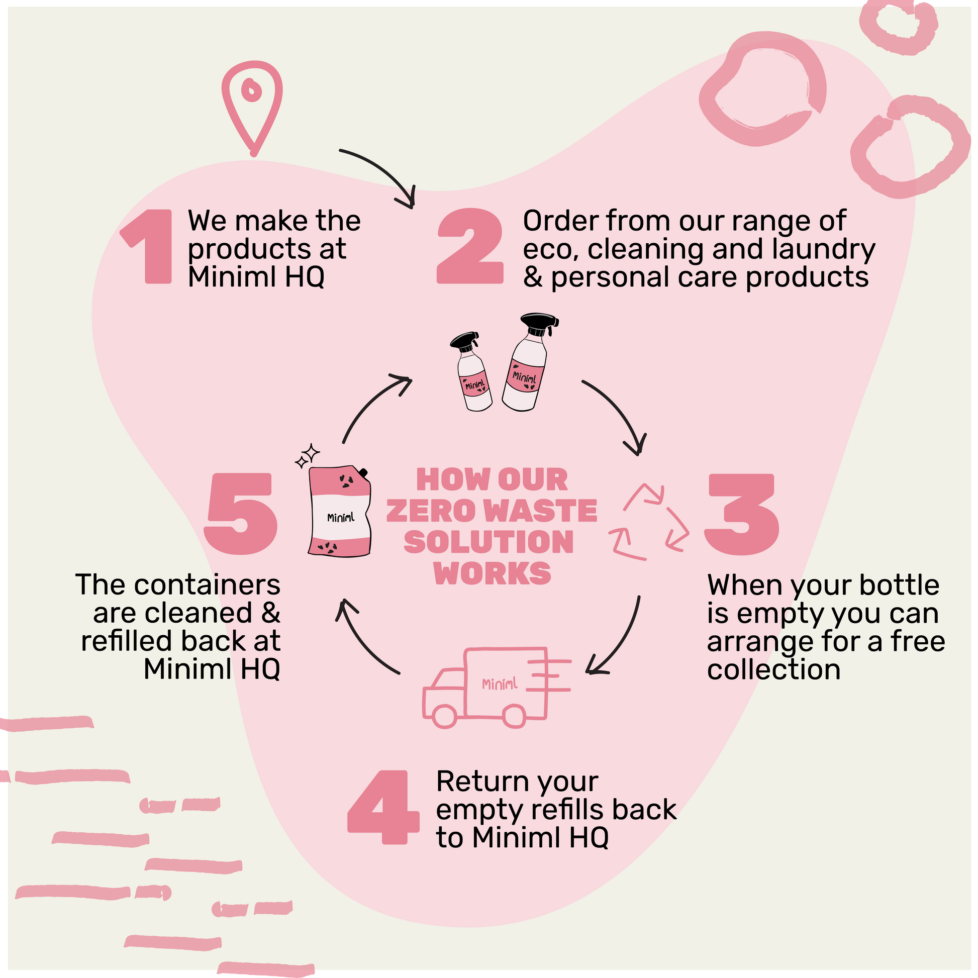At Miniml, we don't believe in single use plastic or recycling. That's why we reuse and refill every bottle that we supply to create a completely zero waste supply chain. Our refill containers are designed to be returned to Miniml HQ to be cleaned and re-used again and again...and again!