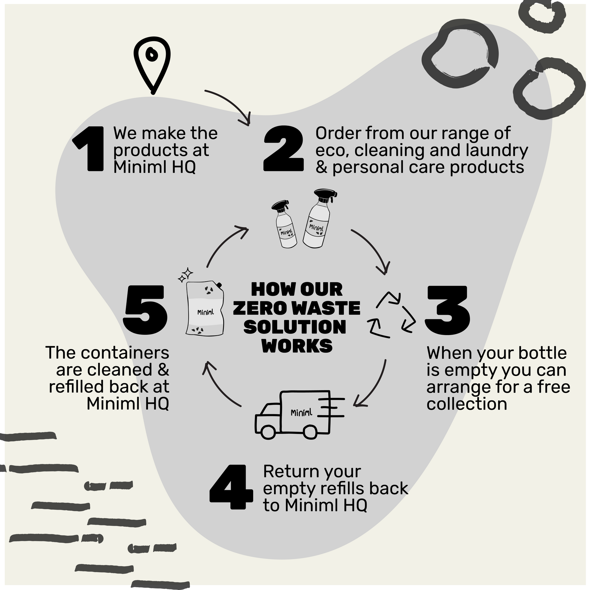 At Miniml, we don't believe in single use plastic or recycling. That's why we reuse and refill every bottle that we supply to create a completely zero waste supply chain. Our refill containers are designed to be returned to Miniml HQ to be cleaned and re-used again and again...and again!