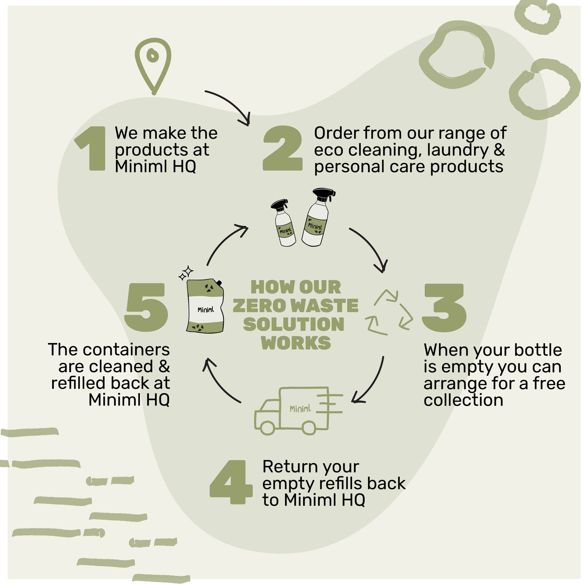 At Miniml, we don't believe in single use plastic or recycling. That's why we reuse and refill every bottle that we supply to create a completely zero waste supply chain. Our refill containers are designed to be returned to Miniml HQ to be cleaned and re-used again and again...and again!