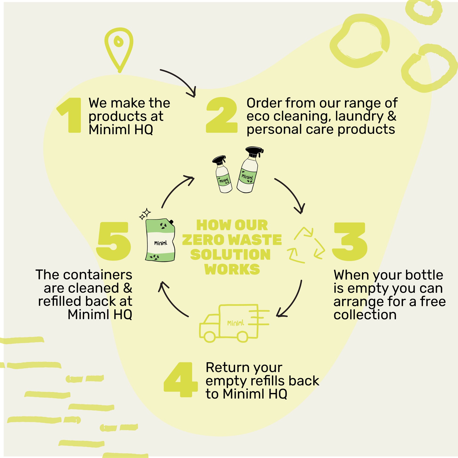 At Miniml, we don't believe in single use plastic or recycling. That's why we reuse and refill every bottle that we supply to create a completely zero waste supply chain. Our refill containers are designed to be returned to Miniml HQ to be cleaned and re-used again and again...and again!