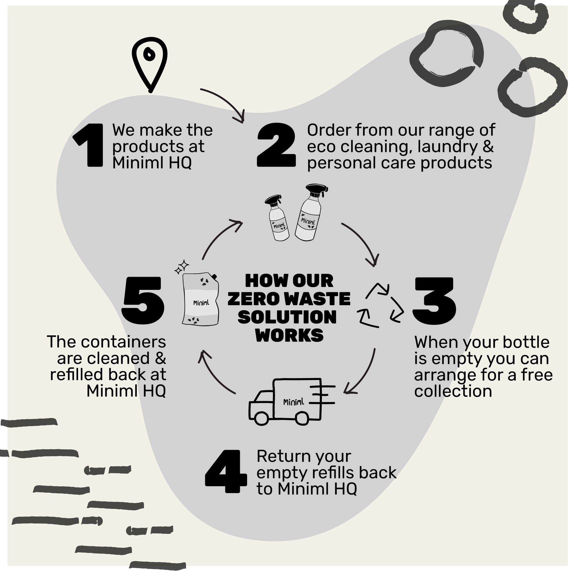 At Miniml, we don't believe in single use plastic or recycling. That's why we reuse and refill every bottle that we supply to create a completely zero waste supply chain. Our refill containers are designed to be returned to Miniml HQ to be cleaned and re-used again and again...and again!